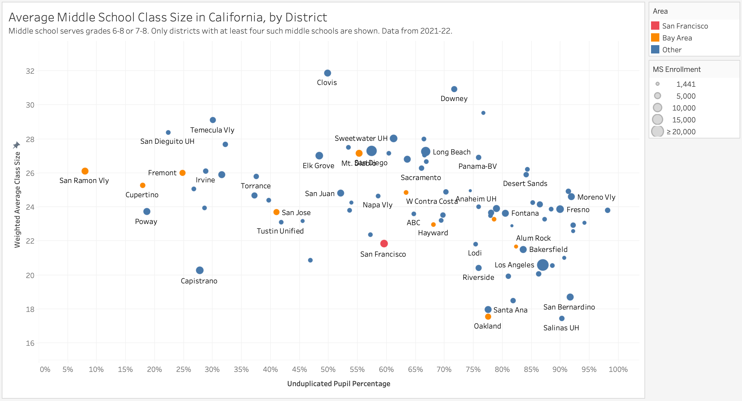 San Francisco’s average middle school class size is 22. Recall that AP Giannini had the highest average class size in San Francisco (25.6). That’s still below the average class size in large Bay Area districts such as San Ramon Valley, Fremont, and Mt. Diablo. Long Beach (27.2) is higher again but the highest average class size is to be found in financially stable Clovis (31.9).