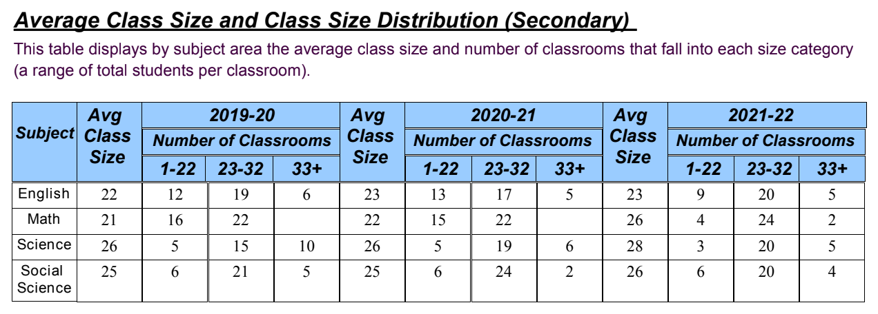 The source of data is again the Student Accountability Report Cards (SARCs). SARCs are published annually but the data is delayed so the most recent data we have is for the 2021-22 school year. To give a sense of what data is available, here’s the relevant excerpt from the SARC for AP Giannini middle school.