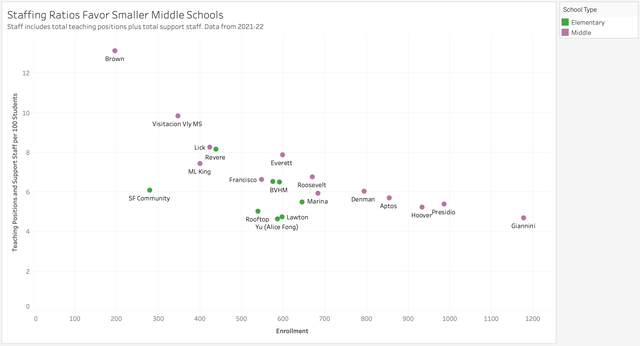 The SARCs also include information on staffing at schools. Staffing includes not just teachers but support staff such as counselors, librarians, social workers, and nurses. Here is the total staffing at each school compared to its enrollment.