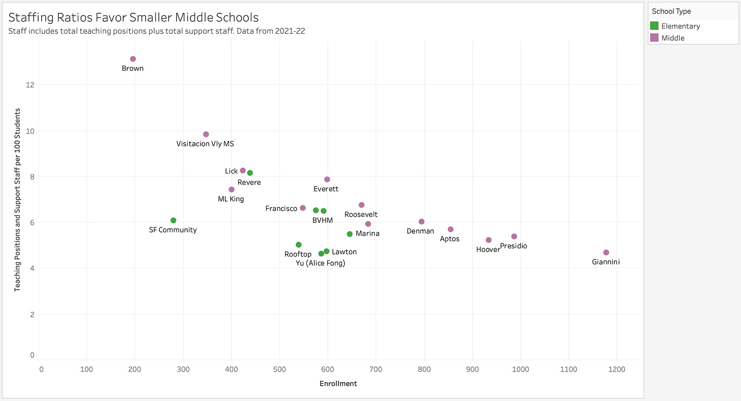 Smaller schools have more staff per 100 students. That’s what we would expect given that we saw in Figure 2 that larger middle schools have larger class sizes which means fewer teachers. There are so few support staff that their inclusion doesn’t change the order that much. But the distribution of support staff is still head-scratching. Everett had the most support staff (1.6 per 100 students), but its demographic and geographic cousin, Lick, had one of the lowest (0.5 per 100 students). The schools with the lowest support staff ratios were Lawton (0.3 per 100) and Hoover (0.4). The schools with the highest support ratios after Everett were King (1.4) and Revere (1.3).